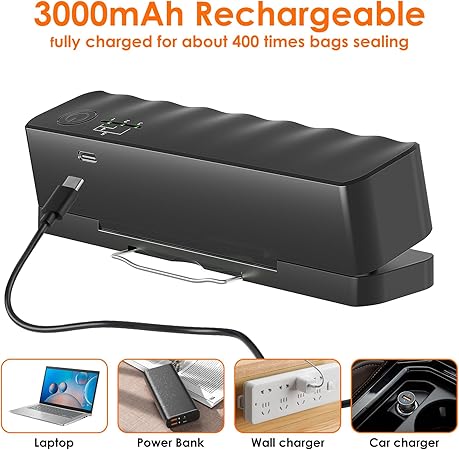 【Şarj edilebilir torba kapatıcı】Bu taşınabilir torba kapatıcı en son teknolojiyi kullanır ve tam şarjdan sonra 400 kez yeniden kullanılabilen dahili bir 3000mAh şarj edilebilir pile sahiptir. Ek pil satın almanıza gerek yok, şarj ettikten sonra güçlük çekmeden kullanabilir ve ayrıca paradan tasarruf edebilirsiniz. Pil gerektiren sızdırmazlık cihazlarından daha çevre dostudur ve çok fazla pil maliyetinden tasarruf sağlar.