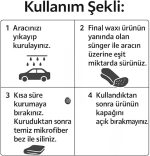 Kullanmadan Önce Dikkat Edilmesi Gerekenler: Güneş altında veya sıcak boya yüzeyine uygulamayınız. Aracın boyalı plastik aksamlarına uygulanmaz