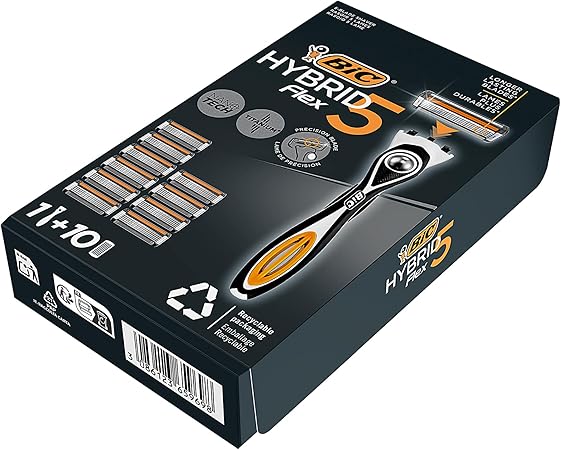 Yakın tıraş için birbirinden bağımsız hareket eden 5 nano teknolojik bıçakla BIC Hybrid 5 Flex erkek tıraş bıçağı ve 10 kartuş