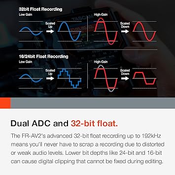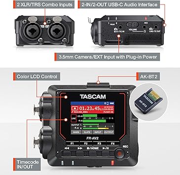 TASCAM FR-AV2, verimliliği büyük ölçüde artırmak için gelişmiş 32 bit kayan kaydı yerleşik zaman kodu oluşturma ile birleştiren kameramanlar için kompakt ve kapsamlı bir ses kayıt çözümüdür. Dahili Zaman Kodu, harici bir zaman kodu cihazına gerek kalmadan endüstri standardı videografi donanımını entegre etmenizi sağlar. İsteğe bağlı AK-BT2 Bluetooth adaptörü ile ses sinyallerinizi kablosuz olarak izleyin. *Not: Bu ürün sadece AK-BT2 adaptörü ile uyumludur.
