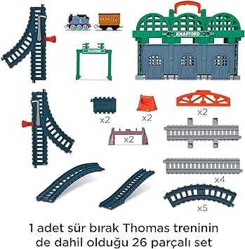 Thomas ve Arkadaşları tren ve pist setinde; ünlü Knapford İstasyonu, tekerlekli Thomas lokomotif ve yolcularla dolu bir yolcu vagonu bulunur