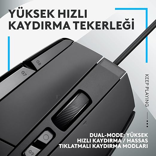 Yeniden tasarlanmış DPI kaydırma tuşu: Bu kablolu optik oyun mouse’u, tutuşunuza bağlı olarak hassas uyarlaması için ters çevrilebilir ve çıkarılabilir bir DPI kaydırma tuşuna sahiptir.