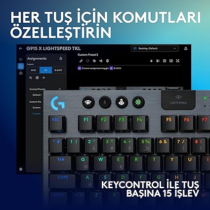 Logitech G G915 X LIGHTSPEED TKL kompakt ve sayısal tuş takımsız tasarıma sahiptir. Düşük profilli GL mekanik anahtarların tetikleme noktası 1,3 milimetre mesafededir
