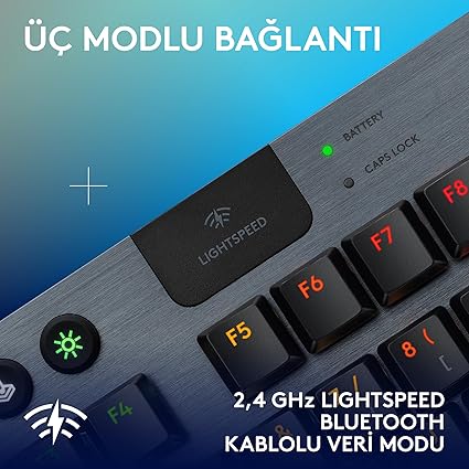Üç modlu bağlantıyla istediğiniz gibi oynayın. Sınıfının en iyisi 2,4 GHz LIGHTSPEED kablosuz, Bluetooth veya kablolu veri modlarından birini seçin ve tek bir tuşa dokunarak birinden diğerine geçiş yapın