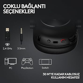 Uzun Pil Ömrü ve Menzili: Profesyonel düzeyde Logitech LIGHTSPEED kablosuz teknolojisi ile donatılmıştır, 50 saate kadar pil ömrü ve 30 metreye kadar 2,4 GHz kablosuz menzil sunar. Rahat: Bu gürültü önleyici kulaklıklar dönen dayanıklı menteşeye ve dönen yumuşak hafızalı köpük kulaklık pedlerine sahiptir NULL suni deri veya nefes alabilen kadife olarak mevcuttur.
