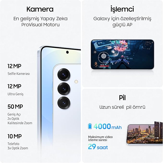 Pil: Uzun pil ömrü Özel uygulama işlemcimize entegre edilen MDNIe teknolojimiz ve yazılım optimizasyonu ile artan pil ömrü sayesinde Galaxy S25 cihazlarınızda uzun süre video izleyebilirsiniz