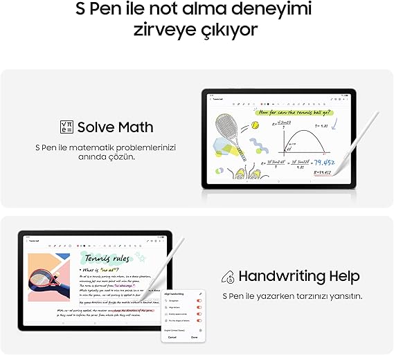 YARATICILIK: Matematik formüllerini S Pen ile hızlıca çözün. Karmaşık bir matematik formülüyle mi uğraşıyorsunuz? S Pen ile yazın, Solve Math sizin için otomatik olarak çözsün. Uygulama değiştirmeden veya odağınızı kaybetmeden matematik problemlerini hızlıca çözmenizi sağlayarak çalışma seanslarınızı kolaylaştırır. İster ödevlerinizi yapıyor olun ister denklem çözüyor olun, öğrenmenize ve ilerlemenize yardımcı olur.