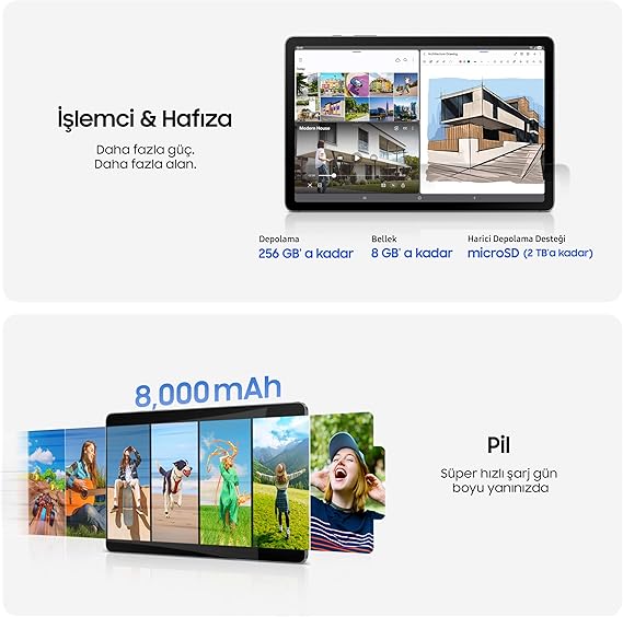 PİL: Süper hızlı şarj gün boyu yanınızda. İş, eğitim ve eğlenceyi kesintisiz yaşamanız için tasarlanmış 8.000 mAh pili sayesinde uzun süre şarja ihtiyaç duymadan kullanın. Şarj etmeniz gerektiğinde Süper Hızlı Şarj özelliği ile beklemenize gerek kalmadan pili hızlıca şarj edin. Galaxy Tab S10 Lite tempolu sabahlarınıza, üst üste gelen planlarınıza ve uzun yayın seanslarınıza uyum sağlar.