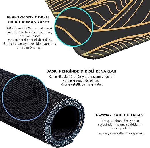 [Kaymaz Kauçuk Taban]: Masanızın yüzeyine tutunarak sabitlenir ve akıcı mouse hareketlerinizi korumak için kumaşın toplanmasını önler.