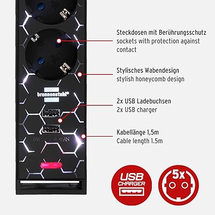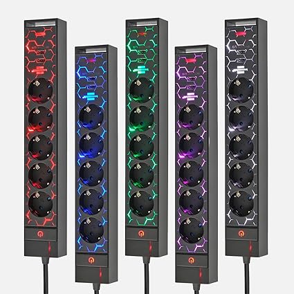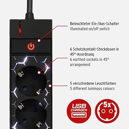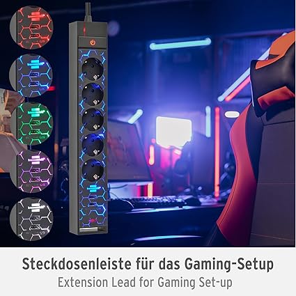Gamer prizi GSL 05 USB LED aydınlatmalı 5 Soketli çoklu priz (oyun kurulumu için LED renk değişimi)