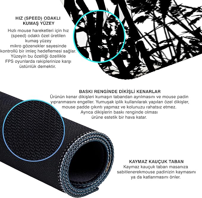 [Kaymaz Kauçuk Taban]: Masanızın yüzeyine tutunarak sabitlenir ve akıcı mouse hareketlerinizi korumak için kumaşın toplanmasını önler.