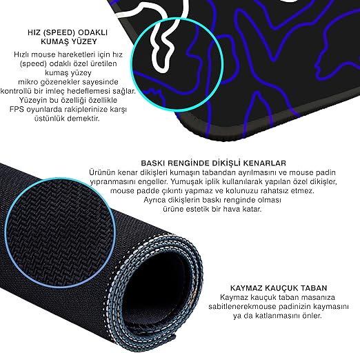 [Kaymaz Kauçuk Taban]: Masanızın yüzeyine tutunarak sabitlenir ve akıcı mouse hareketlerinizi korumak için kumaşın toplanmasını önler.