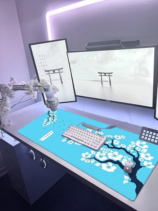 Gaming Sakura Mouse Pad 31×28, 70×30, 80×30, 90×40 Cherry Blossom Mouse Pad XXL Büyük Oyuncu Mouse Altlığı Kiraz Çiçeği Mousepad (Turkuaz-Beyaz, 90×40 cm 3mm kalınlık)