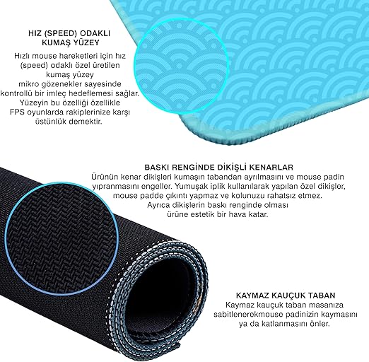 [Kaymaz Kauçuk Taban]: Masanızın yüzeyine tutunarak sabitlenir ve akıcı mouse hareketlerinizi korumak için kumaşın toplanmasını önler.