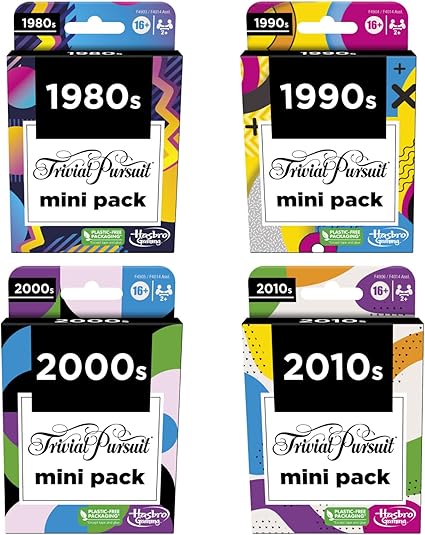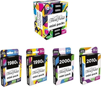 Onlarca Yıl Boyunca Trivia: Bu Trivial Pursuit Game Mini Packs Multipack 4 farklı oyun paketi içerir ve 80’lerden, 90’lardan, 2000’lerden ve 2010’lardan 4 yıllık trivia soruları sunar