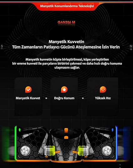 – GÖRÜNÜR MANYETİK: Manyetik sihirli küp ile hiç oynamadıysanız, bunu kaçırmamalısınız! GAN 356 M, içinde güçlü mıknatıslar bulunan bir küptür ve katmanları çok daha hızlı bir şekilde doğru konuma getirebilirsiniz. Görünür mıknatıslar her zaman en iyi markayı elinizde tuttuğunuzu hatırlatır. Manyetik hız küpü yapmanın yepyeni başlangıcına hoş geldiniz!