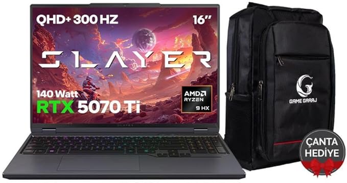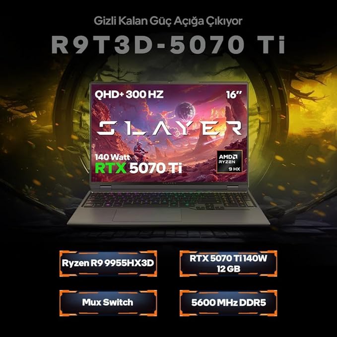 Garaj Slayer R9T3D-5070Ti C1 AMD Ryzen 9 9955HX3D 32GB RAM 1TB SSD RTX5070Ti 16″ QHD+ IPS 300Hz FreeDOS Gaming Laptop