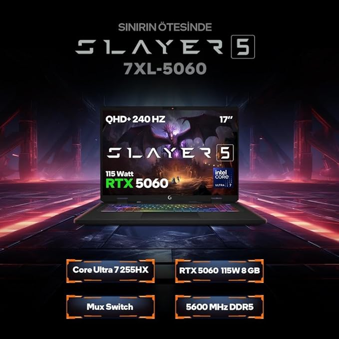 Garaj Slayer5 7XL-5060 C2 Intel Ultra 7 255HX 32GB RAM 1TB SSD RTX5060 17″ 240Hz QHD+IPS FreeDOS Gaming Laptop