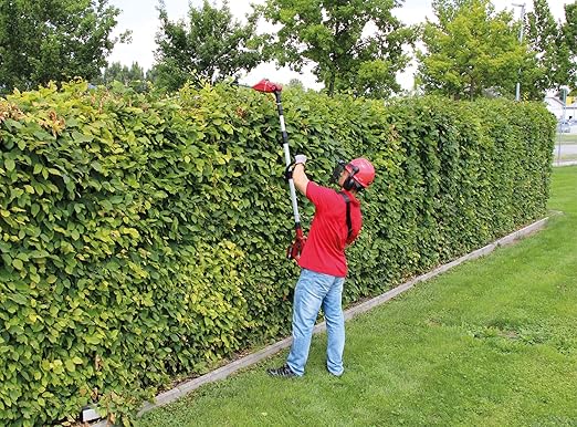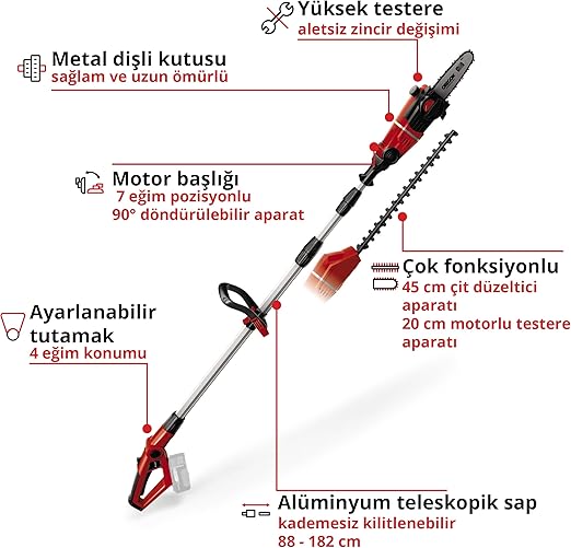 Teleskopik sap, 7 kademeli eğilebilir motor başlığı, kolay yatay budama için 90° döndürülebilir aparat ve ayarlanabilir kulplar.