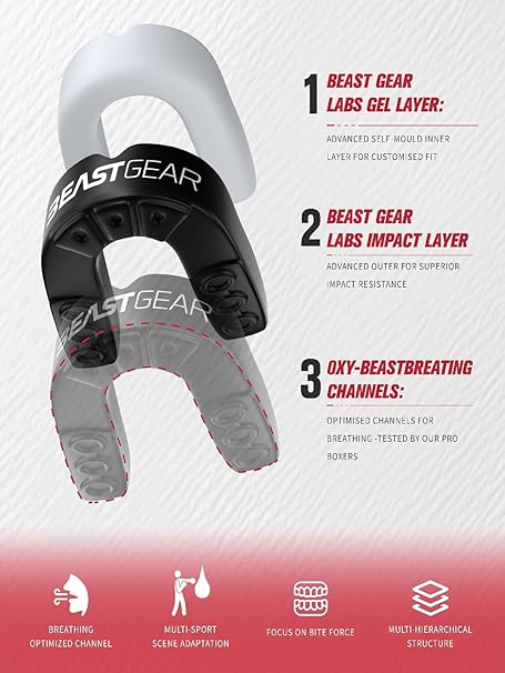 Yüksek giyim konforu – Ağız koruyucu boks üç koruma katmanı sunar: koruyucu, yastıklama ve nefes alabilir. Beast Gear Labs’ Shape teknolojisini kullanan malzeme pürüzsüzdür ve diş etlerine uygundur, spor veya antrenman sırasında rahat ve odaklanmanızı sağlayan nefes alabilen işlevselliğe sahiptir