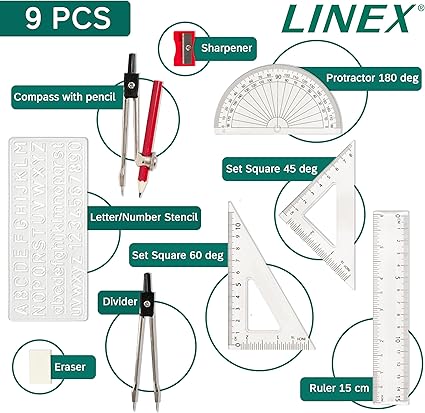 İki metal pergel, iki gönye (45° ve 30°/60°), 15,2 cm uzunluğunda cetvel, 10,2 cm açı ölçer, pergel için bir kalem, bir yazı şablonu, bir kalemtıraş ve bir silgi