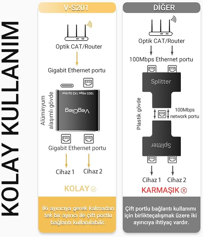 VegGieg RJ45 Gigabit Ethernet Çoklayıcı Splitter Adaptör, tek bir Ethernet portunu iki ayrı çıkışa dönüştürmenizi sağlar. Bu adaptör sayesinde, yönlendiricinizi veya Ethernet anahtarınızı aynı anda iki farklı cihaza bağlayabilirsiniz.
