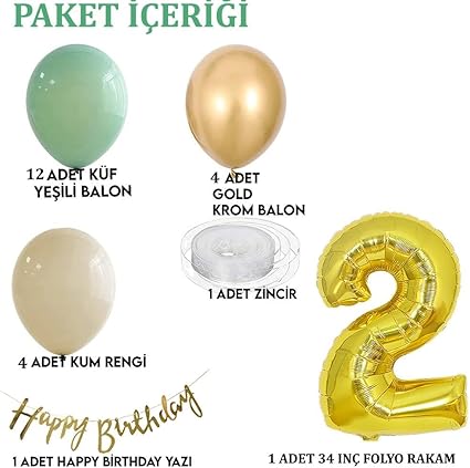 Paket İçeriği: Görselde yer alan Gold 34″ Inc 76 cm rakam folyo balon. (1 adet) 12 Adet Küf Yeşili Balon 4 Adet Krom Gold Balon 4 Adet Deniz Kumu Balon Happy Birthday yazılı Kaligrafi banner. (1 adet) Balon Zinciri 5 metre