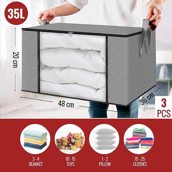 Giysi saklama kutuları, giysi saklama çantaları, dolap organizatörü, güçlendirilmiş kulplu, şeffaf pencereli dayanıklı kumaş kılıfları (açık gri, 3 paket)