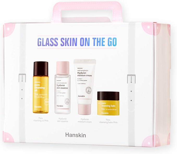 Hareket halindeyken ışıltılı cam bir cilt için Hanskin’in Temel Seyahat Cilt Bakım Seti! Bu kit, seyahat ederken cildinizi temiz, dengeli ve süper nemli tutmak için iki temizleyici, bir nemlendirici öz ve bir nemlendirici krem içerir
