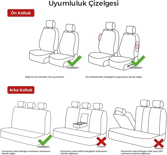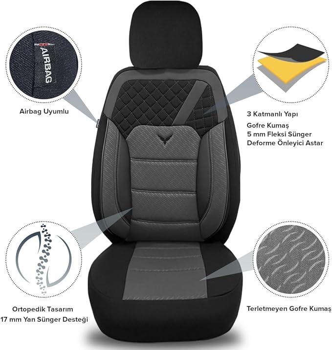 Ön koltuklardaki airbag açıklıkları sayesinde güvenlik elemanlarını destekleyen dikim özelliğine sahiptir.
