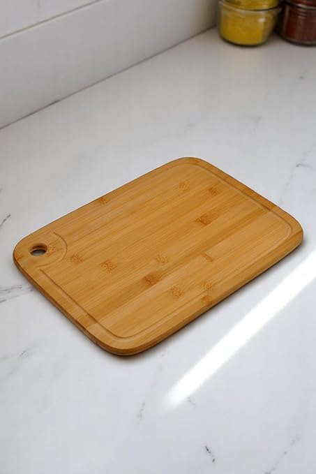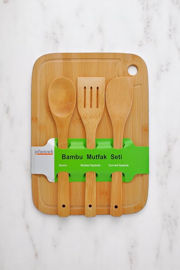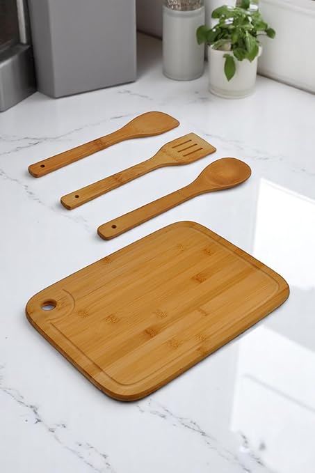Golden Bambu Serisi Oluklu Antibakteriel Yıkanabilir Bambu 36×26 cm Doğrama Tahtası, Kaşık ve Spatula, Tahta Kevgir, 4’lü Set