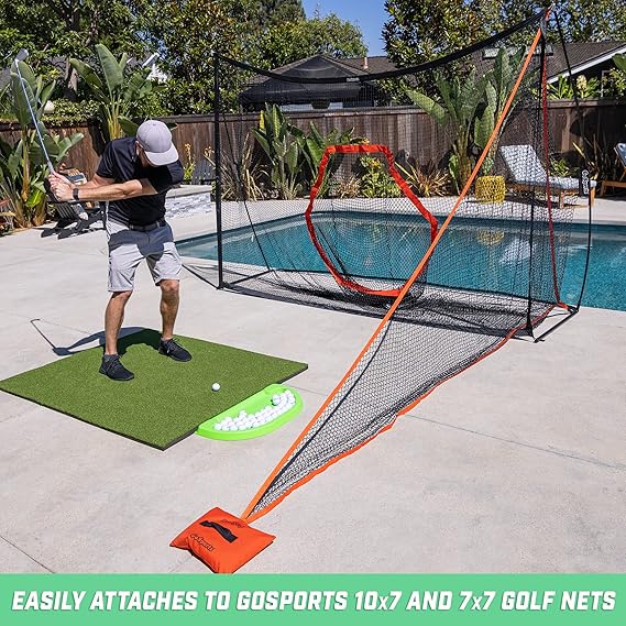 Sap ağı: Hatalı yan atışları yakalamaya yardımcı olan ikincil bir ağ sağlamak için GoSports 10×7 ve 7×7 Golf Vuruş Ağlarına takılır (korkunç sap veya hortum roketi)