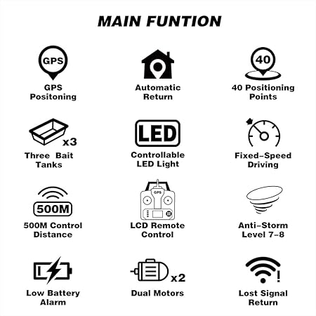 Auto Return: The remote control distance is within 500 meters. When the boat is in low battery,loses signal or exceeds 500 meters,it will return automatically. Don’t be afraid of lose.