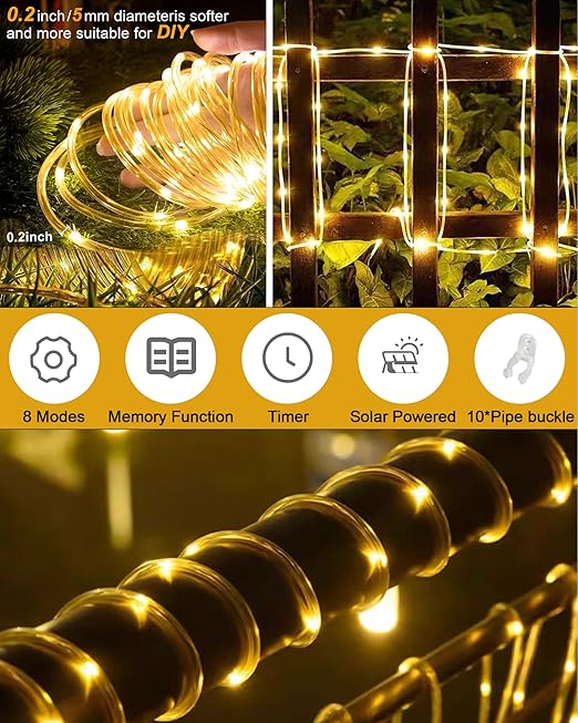 Güneş Halat Işıkları Dış Mekan – 32.8Ft 100 LED String Tüp Işıklar, Bahçe Dış Mekan Dekoru için 8 Modlu Su Geçirmez Güneş Enerjili Peri Işıkları – Sıcak Beyaz