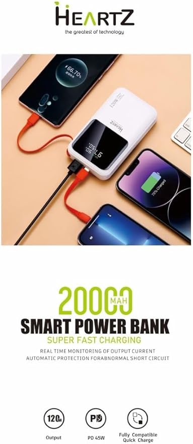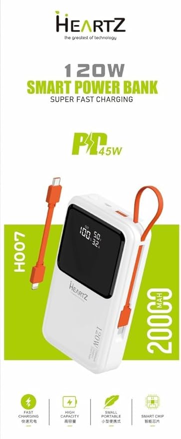 H007 20000 MH PD 45W ve USB 120W FAST HIZLI ŞARJ DAHİLİ TYPE C VE LİGHTNİNG KABLOLU DÜNYA STANDARTLARINA UYGUN POLYMER BATARYA BİREBİR AMPER LCD GÖSTERGELİ POWERBANK