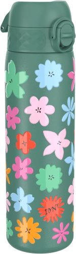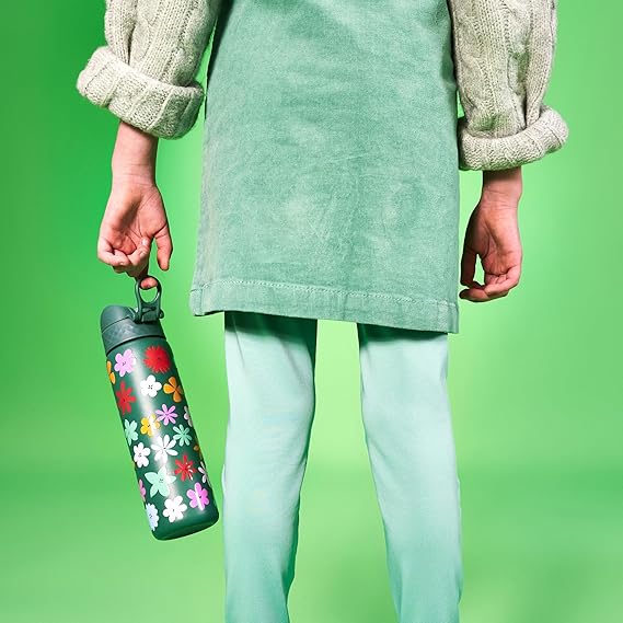 Hafif çelik içecek şişesi, 600 ml, izolasyonsuz, sızdırmaz, tek elle açılır, güvenli kilitleme, bulaşık makinesinde yıkanabilir, katlanır kapak, taşıma sapı, kolay temizlenir, yeşil çiçekler