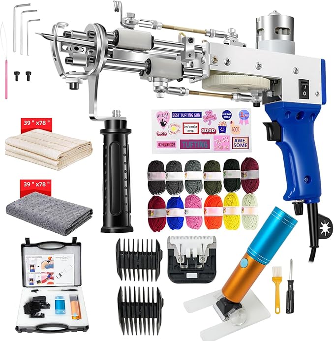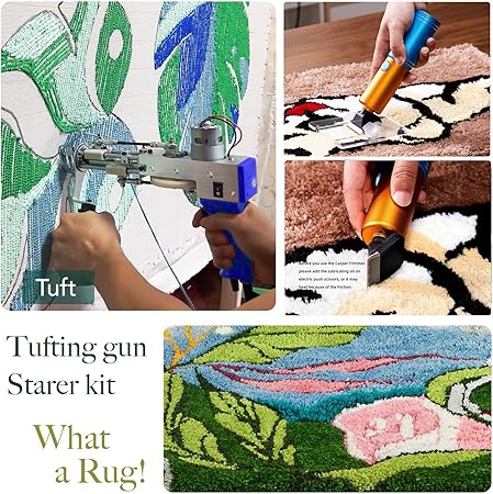 2. 【Tafting Tabancası Başlangıç Kiti】: Tafting tabancası kiti, bir Akülü Halı Düzeltici, bir tafting tabancası, 12 rulo iplik, bir parça 1*2m birincil püsküllü kumaş, bir parça 1*2m destekli kaymaz kumaş,1 içerir tafting tabancası kaplama çıkartmaları, özel bir terzi makası, diş açıcı ve cihazı ayarlamak için diğer kullanışlı araçlar.