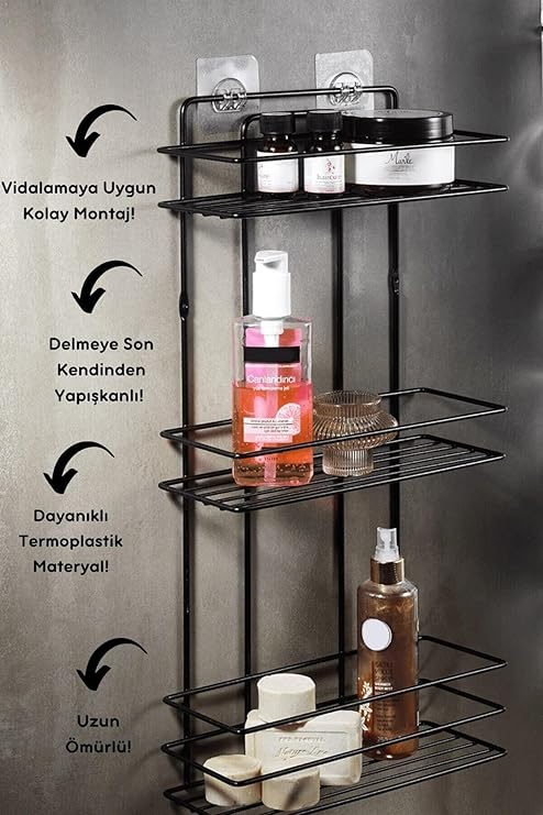 Haus Ömür Boyu Paslanmaz Yapışkanlı Metal Termo Plastik Banyo Düzenleyici Şampuanlık Duş Rafı Siyah Tş-03