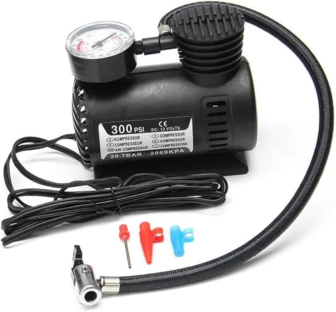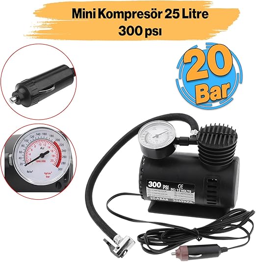 Hava Kompresörü 12V Araç Tipi Çakmaklık Araba Bisiklet Teker Lastik Şambrel Top Şişirme 300 Psı