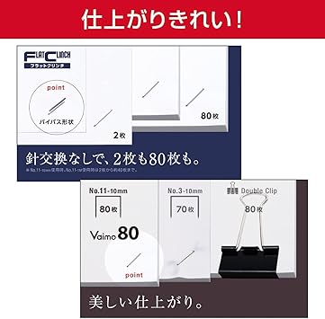 Maksimum yaprak sayısı: 80 yaprak; Kumaş derinliği: 1,2 inç (30 mm) (maks.); Ağırlık: 25,2 oz (690 g)