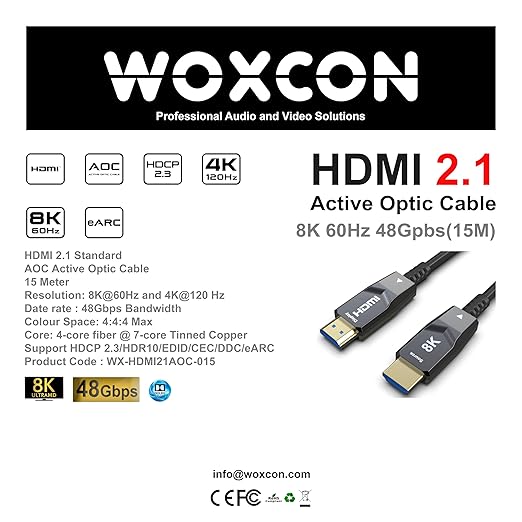 HDMI AOC Fiber Kablo – Hdmi 2.1 Standart – 48Gbps, 8K 60Hz, 4K 120Hz, 4K 60Hz, eARC, HDR, D-HDR, HDCP2.3, Dolby Vision, Dolby Atmos (15 Metre)