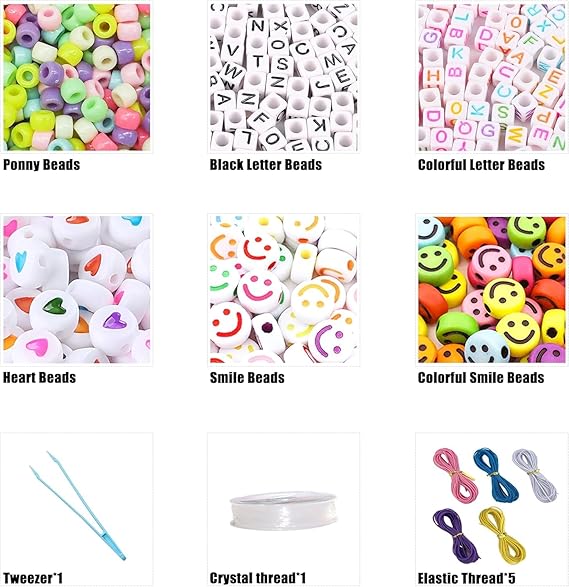 Mükemmel DIY Bilezik Yapma Seti: 1 kutu 24 renkte yaklaşık 600 adet midilli boncuk, 240 adet harf boncuk (A-Z, Siyah ve renk karışımı, harf başına 8-12), Renkli 60 Adet Gülümseme Boncukları ve 60 Adet Renkli Kalp Boncukları içerir. 3 Adet Plastik kanca (okul çantalarından, sırt çantalarından asmak için kolye yapmak için), 3 adet Elastik kordon (renk başına 1,5 m/60 fit), 1 adet plastik kanca 10’lu rulo metre elastik ip, En sevdiğiniz renk ve stile göre bilezik veya takı yapabilirsiniz.