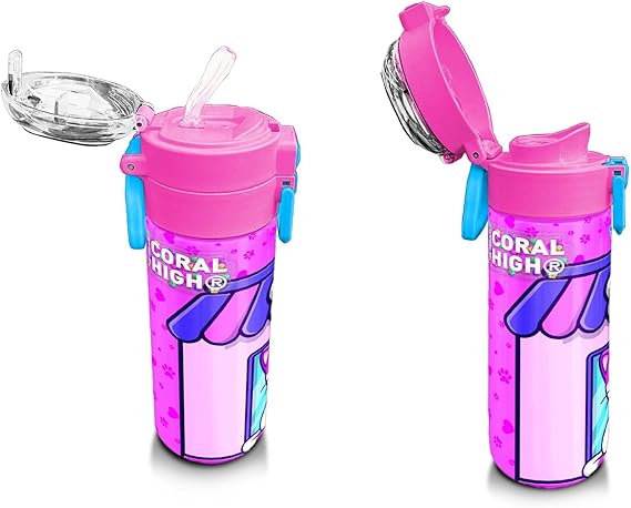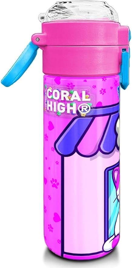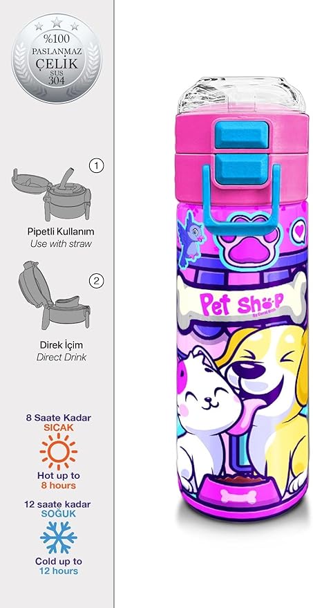 High 500 ml Kedi Köpek Desenli – Kız Çocuk Paslanmaz Çelik Okul Termosu/Suluk/Matara