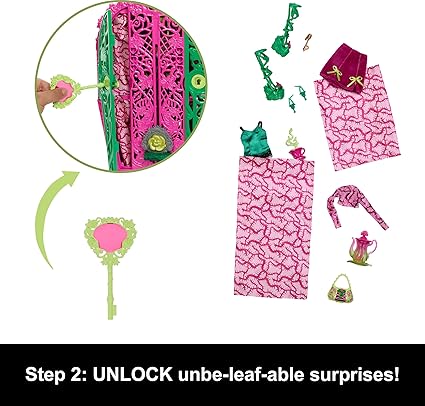 Monster High kapıları ardındaki sırları açığa çıkarın: Gizemli Bahçe giysi dolabı seti! Venus McFlytrap bebek, bitkilerden ilham alan giysiler ve aksesuarlar sete dahildir.