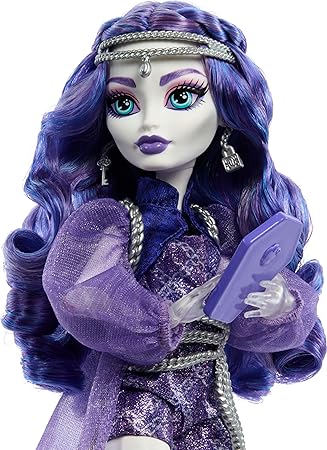 Monster High Spectra Vondergeist bebek, mor pusudaki hayalet zarafetin özüdür! Ürkütücü hikaye anlatımını ve stil eğlencesini teşvik etmek için birçok temalı parça ile birlikte geliyor.