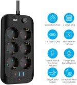 Hoala Termal Akım Korumalı, 6’Lı Priz Soketi, 2x USB Girişli, 1x Type-C Girişi, Çocuk Korumalı Uzatma Kablosu (2mt kablo)