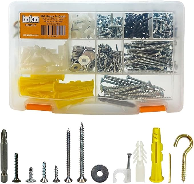 Hobi-2 502 Parça 14 Çeşit, Pul, Çivi, Piton, Kroşe, Vida ve Dübel Seti, Takım Çantalı