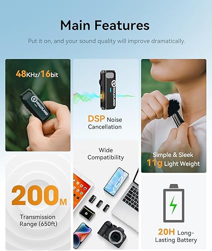 Aktif gürültü azaltma – Yenilikçi Hollyland patentli HearClear teknolojisi aktif gürültü azaltma teknolojisi tek bir tıklamayla etkinleştirilebilecek şekilde tasarlanmıştır. Devrim niteliğindeki algoritması ile tüm ortam gürültüsünü filtreler, böylece sesiniz net ve net kalır. Fonksiyonu devre dışı bırakırsanız, Lark M1 kablosuz lavalier mikrofonu daha gerçekçi görünen daha ayrıntılı bir ses çalma sağlar