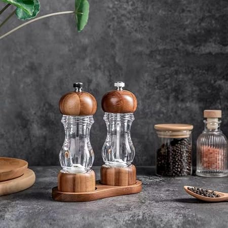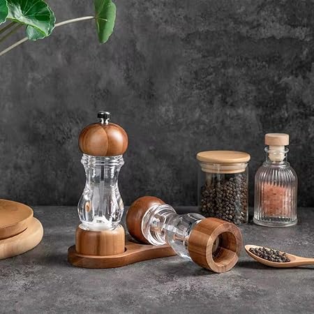Home 2 Adet Ahşap Kapaklı Bambu ve Akasya Ağacı Şeffaf Akrilik Tuz ve Karabiber Baharat Öğütücü – Doğal Ahşap Tasarımıyla Şık ve Dayanıklı, Ayarlanabilir Seramik Değirmen (Akasya Ağacı, 19 Cm)