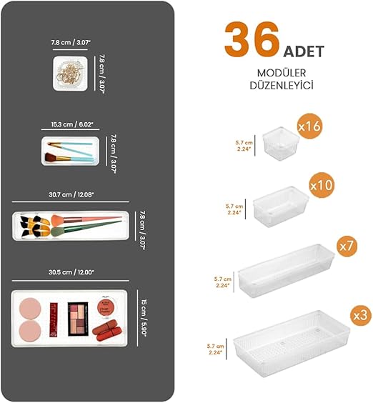 Home 36’lı Mega Set Modüler Çekmece İçi Organizer – Banyo Takı Aksesuar Düzenleyici Şeffaf